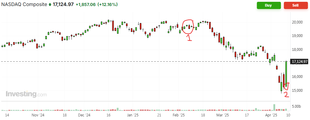 1번 시점에 트럼프는 관세정책으로 인한 고통이 있을 수 있다고 발언했습니다. 나스닥 지수는 그 이후로 급격한 조정을 겪었죠.