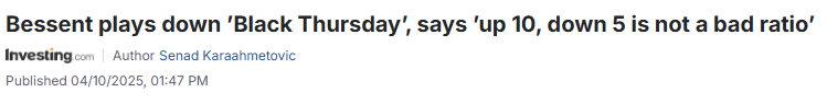 10% up - 5% down으로 검은 목요일이라고 할 수 없다... 뭐 틀린 말은 아니네요. 어쨌든 중요한 건 나바로와 러트닉이라는 MAGA 광견들이 2군으로 물러나고, 시장의 신뢰도가 그래도 높은 베센트가 1군 주전으로 나선 것으로 보인다는 거죠.