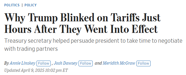 트럼프 90일 관세 유예 조치 이후, 당시 상황을 다룬 기사들이 쏟아지고 있습니다. 트럼프가 이미 수 일 전부터 주식 및 채권 시장을 면밀히 살피고 있었고, 대처 방안을 이미 고민해 왔다고 하네요. 지난 주말, 국채 금리가 급등하기 전부터 빌 애크먼이 90일 유예를 언급한 것 역시 단순히 애크먼의 망상이 아니었던 거죠. 동시에 백악관에서 가짜 뉴스라고 치부했지만, 가짜 뉴스도 아니었다는 말이구요.