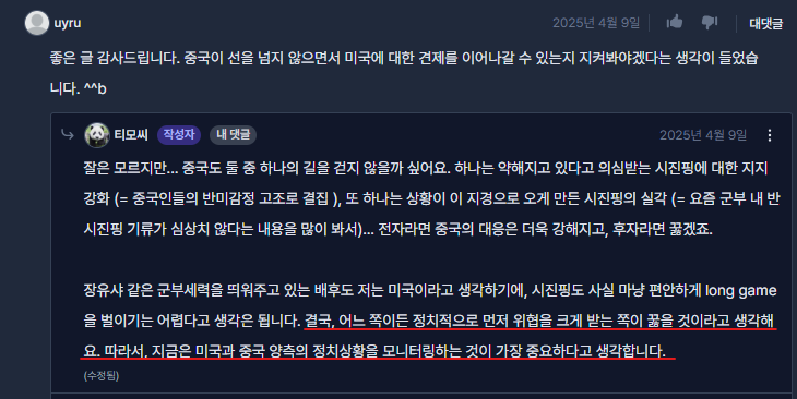 상기 포스트에 대한 uryu님의 덧글에 제가 남겼던 대댓글... 저는 미국과 중국 중 정치적으로 먼저 코너에 몰리는 쪽이 먼저 꿇을 것이기에 미중의 정치상황을 모니터링하는 것이 중요하다고 생각했습니다.