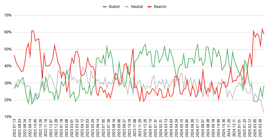 AAII 투자자 심리 추이를 보면 빨간선 Bearish의 비중이 역대급으로 높아졌습니다. 주목할 점은 의외로 회색선 Neutral 인데 역대급 저점을 기록 중이에요. 이는 투자자들의 시각이 극도로 양분화되어 있는 상황인데, Bear의 비중이 Bull에 비해 압도적으로 높아진 상태라는 의미죠. 이렇게 심리가 양분되어 있으니 시장이 극도의 변동성을 보이고 있다고도 이해할 수 있습니다.