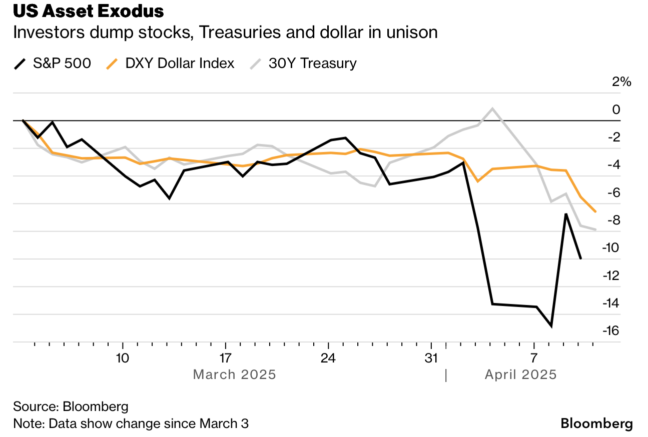 발등에 불이 떨어질 만도 하죠. 4월 2일 이후, 달러 표기 자산에 대한 전방위적인 매도가 이어졌습니다. 다들 잘 알고 계시죠 이미. 4월 4일까지는 주식은 매도했지만, 장기 국채는 적극 매수했죠. 하지만, 그 이후 장기 국채에서 급격한 매도가 쏟아졌고, 그 영향으로 달러 인덱스도 급락을 시작했습니다.