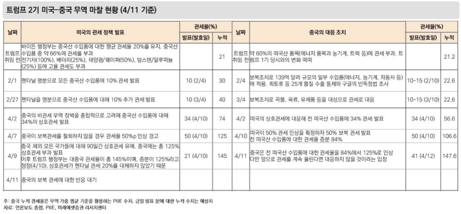 차주 시장이 어떻게 반응할 것인지 제가 정확히 알 수는 없죠. 하지만, 불안에 떨던 시장에게 가뭄의 단비와 같은 좋은 소식인 것만은 분명합니다. 단순히 테크 기업들에 대한 수혜만이 아니라 직전 포스트에서 다룬 것처럼 트럼프의 대중 화해 메시지로 이해할 수 있어 이번 관세 대재앙으로 초래된 긴장상태가 예상보다 빠르게 조기 종료될지도 모른다는 기대감도 커질 수 있습니다.
