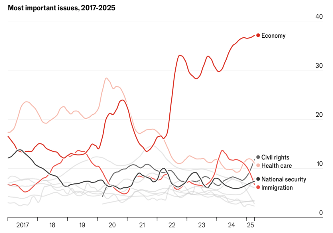 응답자들이 가장 중요하게 생각하는 사안은 역시나 경제입니다. 안 그래도 압도적으로 높았는데, 25년에 들어서며 계속해서 고점을 갱신하고 있죠. 그만큼 경제라는 사안에 유권자들이 매우 민감한 상태입니다.