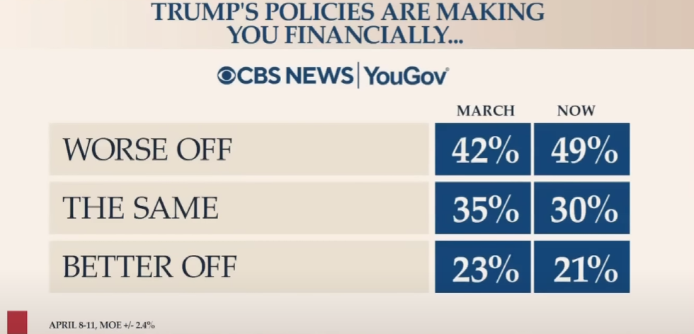 트럼프의 경제정책으로 주머니 사정이 나빠졌다고 응답한 이들의 비중이 지난 달에 비해 크게 늘어났고, 거의 과반에 도달한 상태입니다.