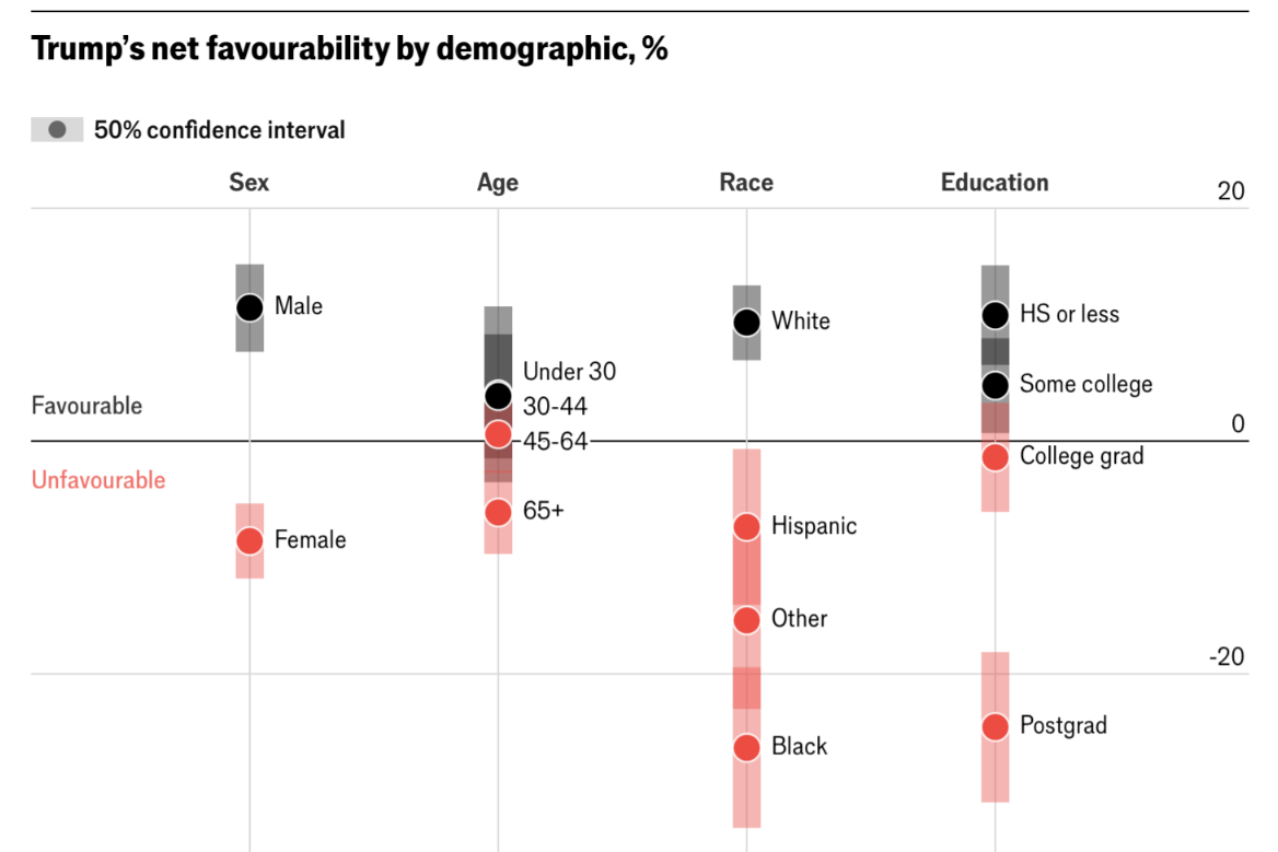 그러면, 트럼프의 정치적 입지는 어떤 상태일까를 봅시다. 먼저 Economist의 Trump 지지율 트래커입니다.