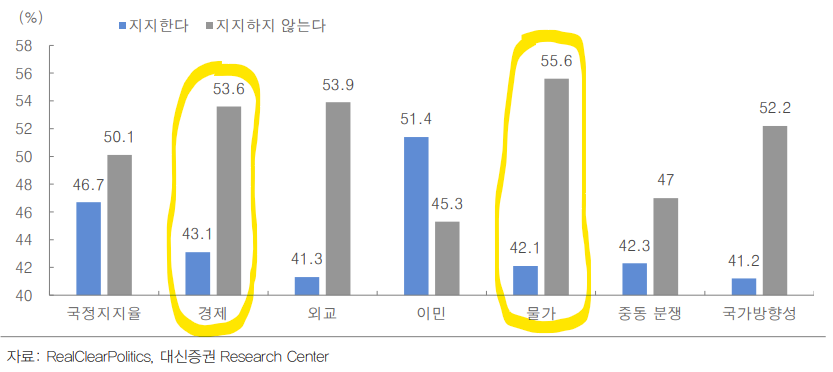 대신증권 리포트에서 발췌... 일자리와 경제라는 주제에 대해 부정적인 평가가 10% 이상 크게 벌어져있죠? 물가에 대해서는 훨씬 더 심해서 13% 이상 부정적 평가가 높은 상태입니다.