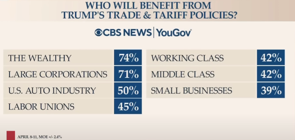 트럼프의 무역 및 관세정책으로 누가 수혜를 볼 것이냐는 질문에는 압도적 다수가 부유층과 대기업이 수혜를 받을 것이라 응답했습니다. 사실 맞는 말이죠. 소기업, 소비자들은 정책이 달라진다고 해서 대응을 할 수가 없는 입장이니까요.