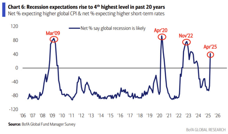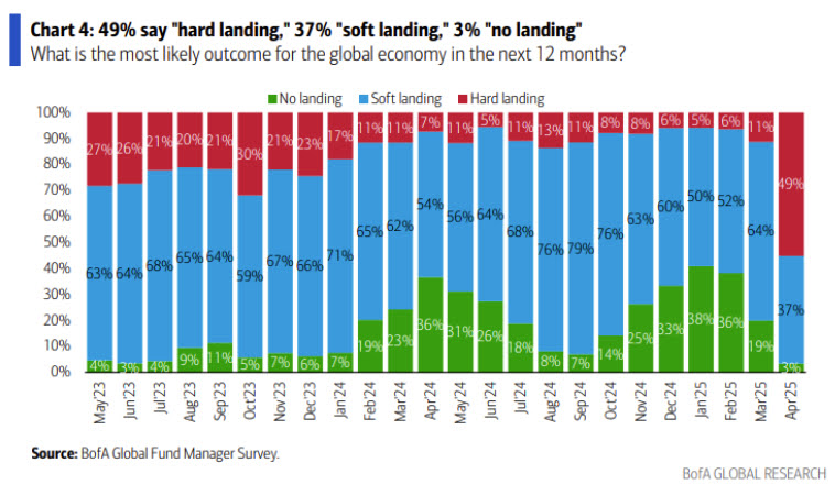 글로벌 경기침체 가능성에 대한 예상치가 과거 20년간 4번째로 높은 수준으로 수직상승 했습니다. 보시는 것처럼 GFC, 팬데믹, 베어마켓이 끝나던 22년 말 이후 최고 수준이죠. 앞서 소프트랜딩+노랜딩 기대치가 한 달만에 90%에서 40%로 절반 넘게 줄어든 상황과 비슷합니다.
