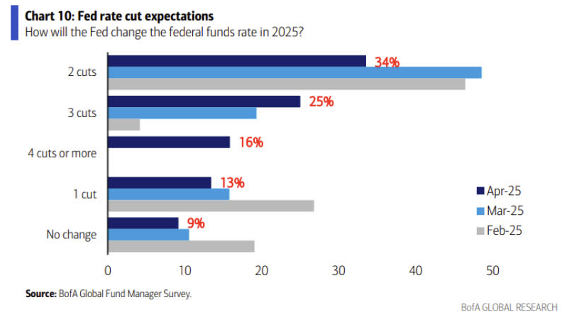 25년 연준의 기준금리 인하 횟수에 대한 기관 투자자들의 예상... 2회 인하는 줄어들고, 3회 이상의 인하가 늘어나고 있죠. 그러니까, 인플레이션보다는 저성장에 연준이 대응할 것이라고 보는 겁니다. 왜? 기관 투자자들이 보기에 인플레이션은 트럼프의 오락가락 관세 정책에 기인한 것이지 구조적인 현상이라고 보지 않기 때문이겠죠. 파월의 발언과 일맥상통하는 측면이 있네요.