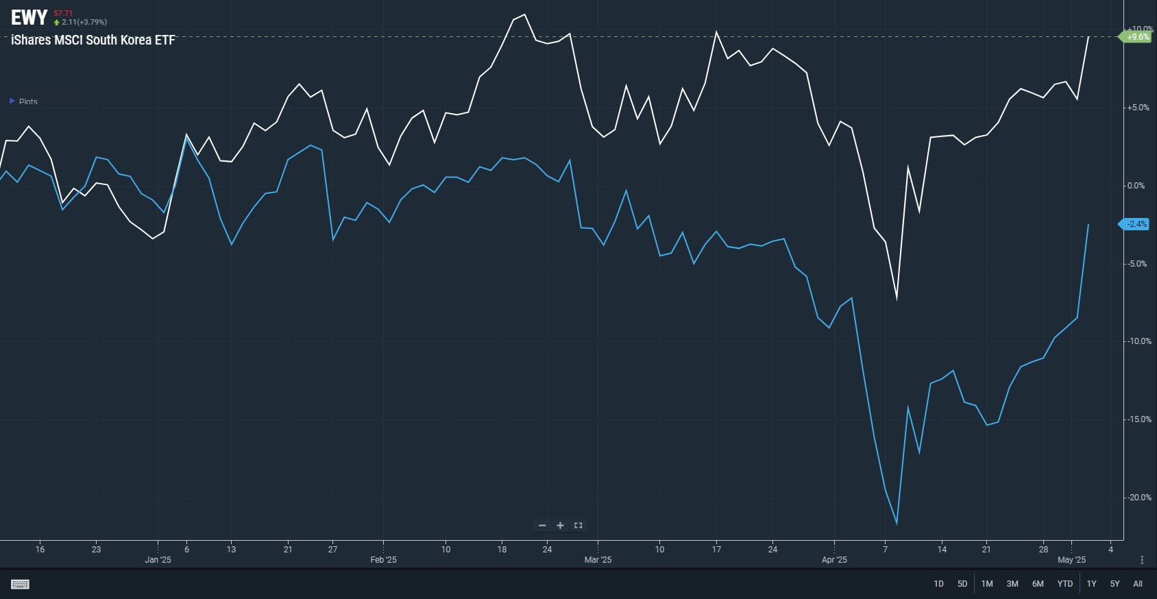MSCI Korea ETF인 EWY와 MSCI Taiwan ETF인 EWT 역시 동반 급등합니다. 환이 강해진 폭에 걸맞게 양국 ETF 상승폭이 움직입니다.