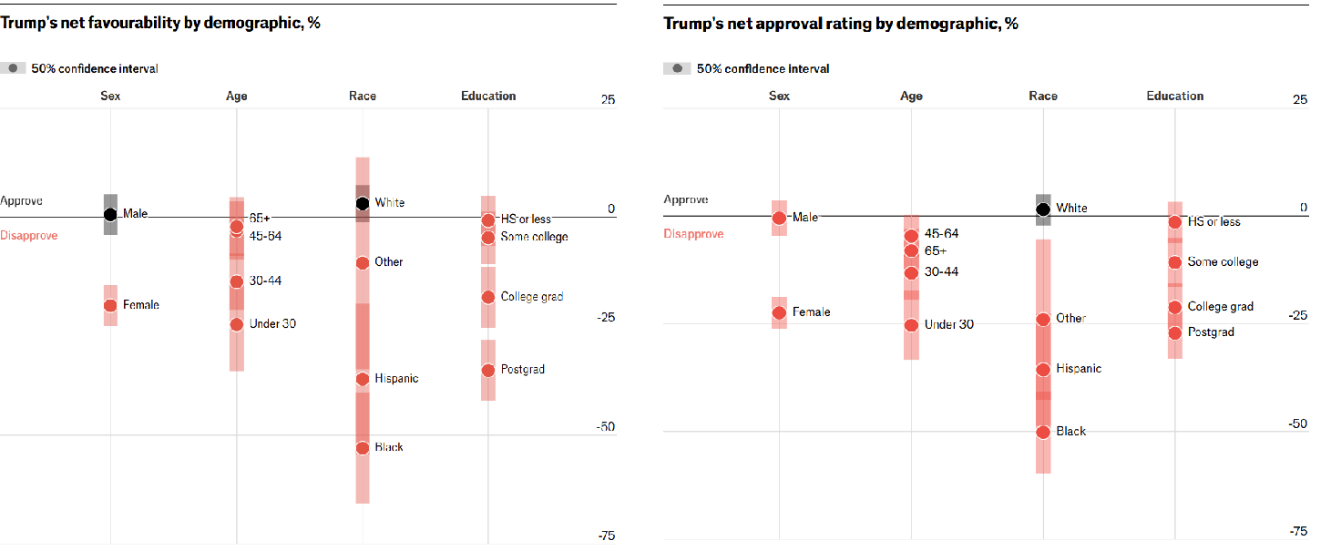 인구 구성 별로 변화를 보면 4월 20일 (좌측) 과 비교했을 때 disapprove 쪽으로의 쏠림도 멈추었습니다. disapprove의 비중이 여전히 매우 크지만 아래쪽으로 더 크게 움직이는 모습은 나타나지 않고 있죠. 즉, 트럼프의 지지율은 바닥을 확인한 모양새입니다.