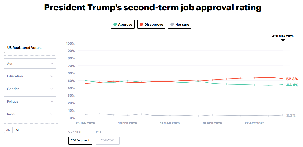 YouGov의 트럼프 지지율 종합 차트도 비슷한 결과를 보여줍니다. Disapprove가 4월 28일에 54%를 찍고...