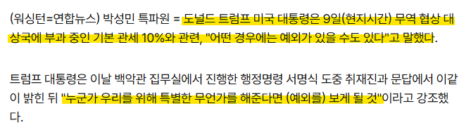 허허... 뭔가 타는 냄새 안 나시나요? 워싱턴 쪽에서 뭔가 타는 것 같은데... 그렇게 세게 나가더니 어디까지 물러설 생각일까요? 70여국에서 몰려와서 자기 발 밑에 무릎을 꿇고 당장이라도 압도적으로 유리한 협상이 팡팡 터질 것처럼 떵떵대더니, 상호 관세율 10%를 낮추어 줄 수도 있다?