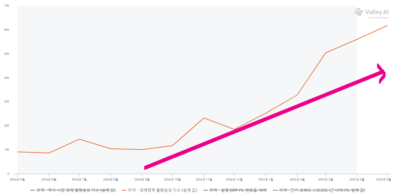 같은 시기 상승세로 반전한 지표가 있습니다. 바로 경제정책 불확실성 지수입니다.
