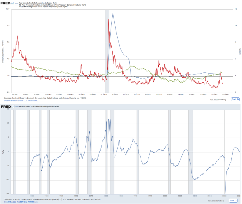 하단 차트... 기준금리와 실업률 스프레드는 잘 알려지지 않은 경기침체 전조 시그널인데 보시다시피 스프레드가 급락하며 0에 근접하기 시작하면 어김없이 경기침체가 왔었죠. 현재 위치를 보면 24년 하반기부터 급락하기 시작해 현재는 0.13에 불과합니다. 불안불안하죠?
