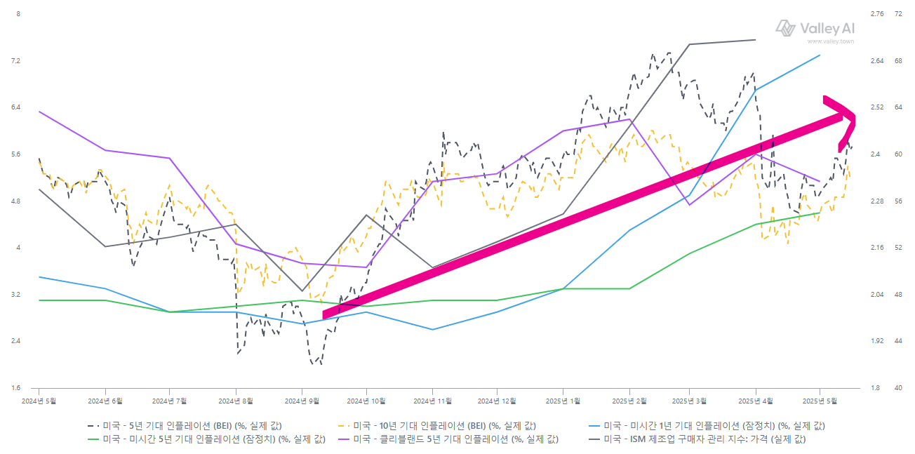 먼저 물가... 각종 기대 인플레이션 수치 및 소비자 물가 선행지표들은 4월 관세 대재앙 이전부터 상승세였고, 4월 이후부터 금융시장과 소프트 데이터를 중심으로 기대 인플레이션이 급증하고 있습니다. 보시면 24년 하반기에 들어서면서 지표들이 전반적으로 상승추세로 전환되었음을 알 수 있죠.