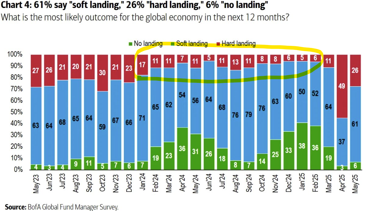 BofA Fund Manager Survey의 하드랜딩 예상 비중을 보세요. 24년 내내 경제지표가 서서히 악화되는 추세였음에도 불구하고 기관 투자자들의 하드랜딩에 대한 예상은 극도로 낮았습니다. 트럼프 당선 이후 트럼프 트레이드가 극에 달할 때까지 계속해서 낮아졌죠. 트럼프 당선 이후 노 랜딩에 대한 기대감이 얼마나 높아졌는지 녹색 막대를 보면 알 수 있습니다.
