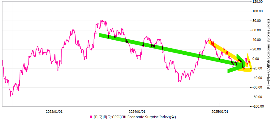 CESI의 추세를 보아도 노란 형광펜 화살표를 보면 24년 11월에 고점을 찍고, 현재까지 하락세를 유지하고 있습니다. 경제지표들이 트럼프 당선 이후로 꾸준히 예상보다 좋지 않았다는 의미죠.