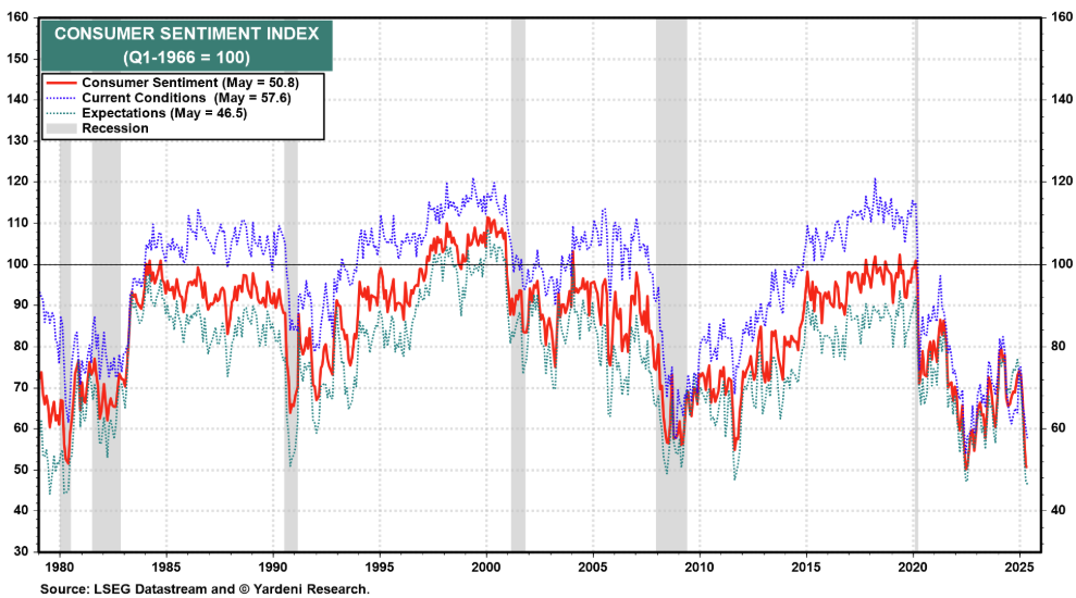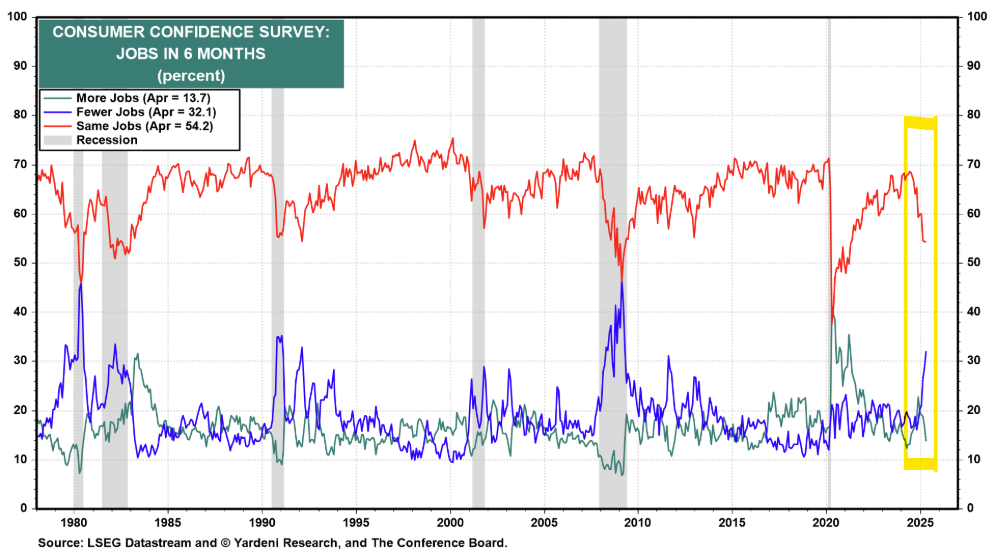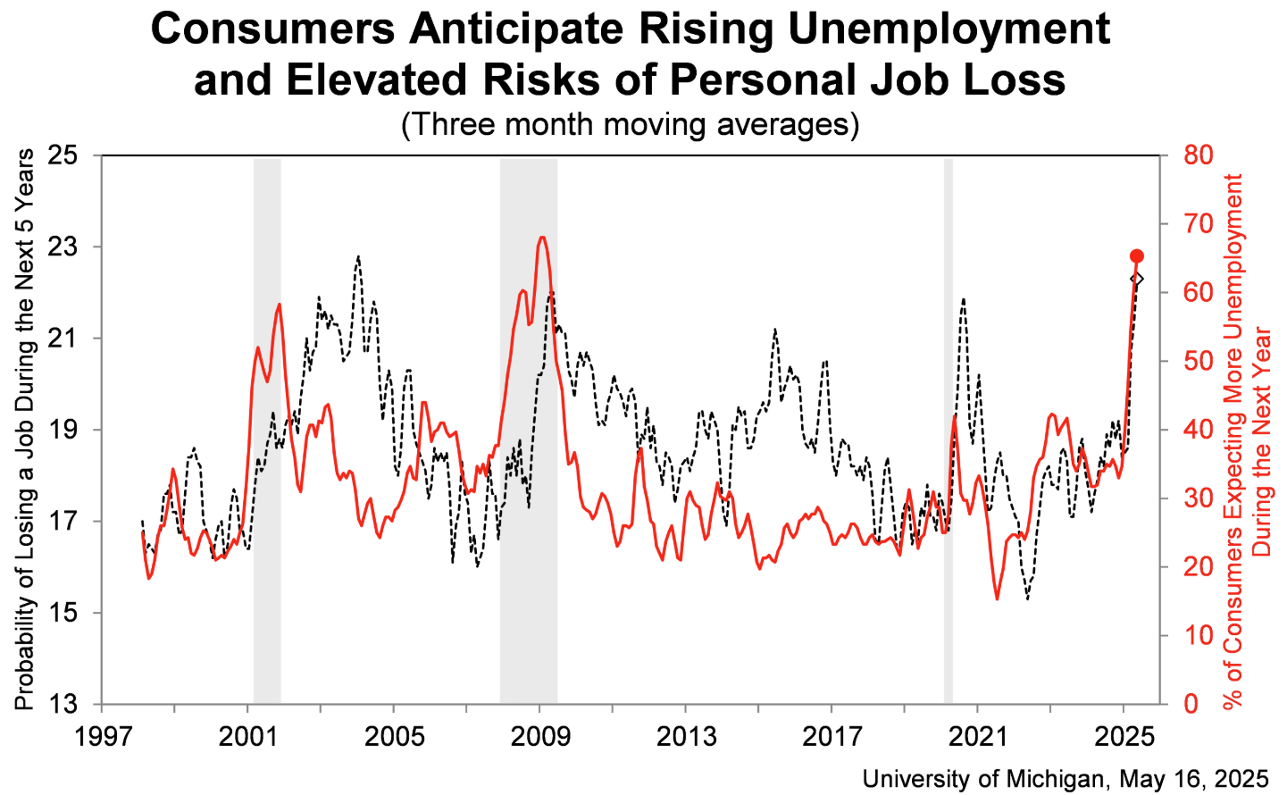 컨퍼런스 보드 차트에서 경기침체 구간에서 향후 일자리 수가 감소할 것이라는 기대를 나타내는 파란선이 급등하는 것이 보이죠? 25년 이후의 파란선 급등세는 경기침체 구간에서 보여지는 추세와 동일합니다. 마찬가지로 미시건대 소비자 설문에서도 고용상황 악화를 예상하는 답변이 늘어나면 경기침체에 들어서죠.