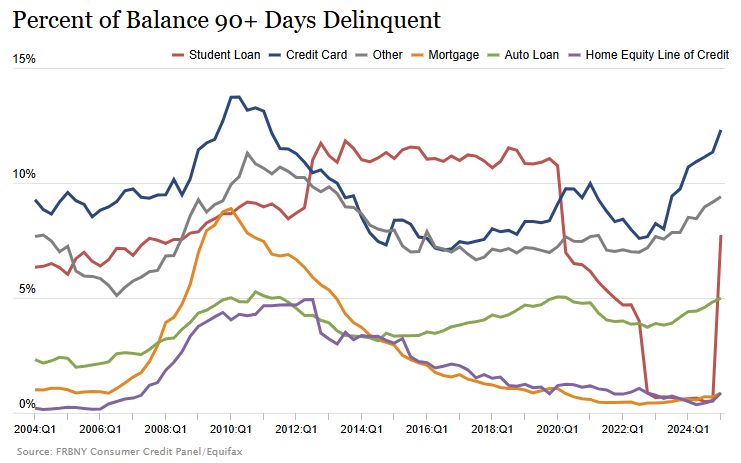 서서히 가계의 대출 상환 지연율이 높아지고 있다는 언급들이 늘어나고 있죠. 25년 1분기 기준 신용카드 90일 이상 연체율이 급상승했습니다 (뉴욕 연준 가계부채 리포트). 거의 08년 GFC 수준에 버금갈 정도입니다. 학자금은 정책 이슈가 있어 예외로 친다 해도 나머지 대출의 연체율도 우려스러울 정도로 상승하고 있죠.