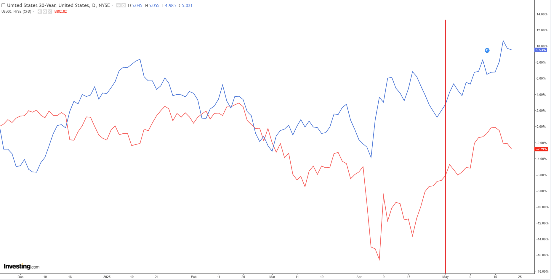 BBB에 대한 관심도가 5월 초부터 높아지기 시작하면서 시장 분위기가 달라집니다. 미국 장기 국채 금리가 급등하기 시작하죠. S&P500은 어느새 4월 관세 대재앙 이전 수준을 넘어설 정도로 강하게 ...