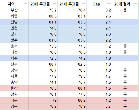 7시 기준으로 비교... 20대와 21대 투표율의 gap으로 소팅했습니다. 묘하게도... 윤이 승리했던 지역의 투표율 상승률이 다 낮죠? 유일한 예외는 부산입니다. 윤 승리지역 중 유일하게 지난 번에 비해 투표율이 높아졌고, 증가율도 1.3%로 꽤 높은 편입니다. 그러니까... 부산의 표심이 어떻게 움직였느냐에 따라 득표 차이가 결정될 듯 하네요.