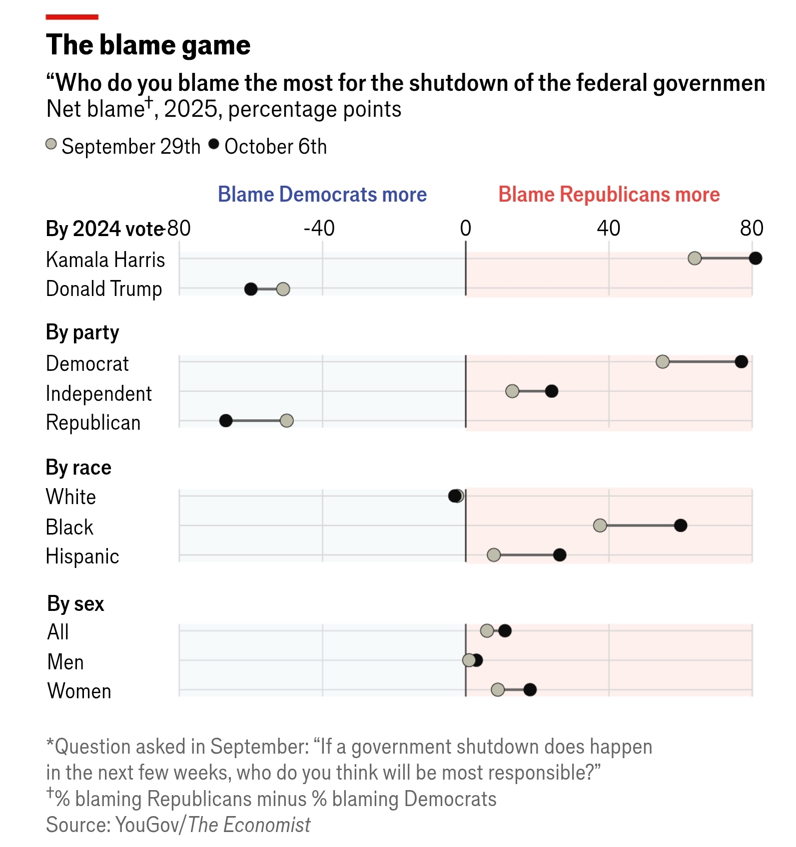 셧다운 직전과 직후의 주요 인구층들의 셧다운 상황에 대한 반응입니다. 왼쪽으로 점이 몰릴수록 셧다운의 원흉을 민주당으로, 오른쪽으로 몰릴수록 공화당을 원흉으로 본다는 의미에요.
