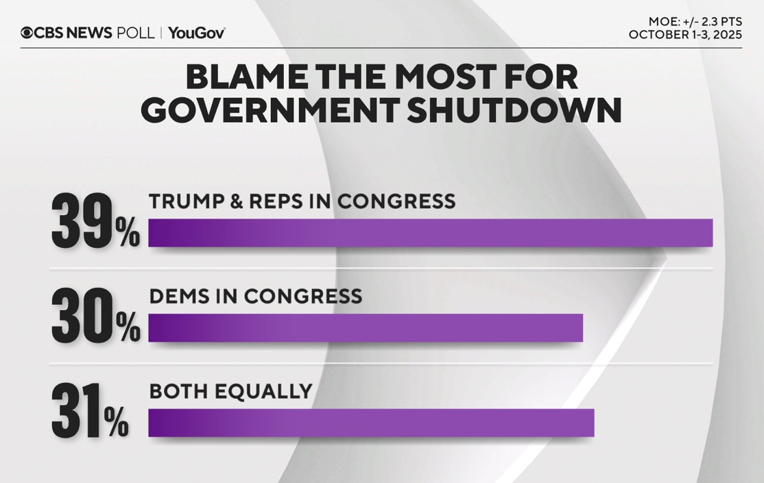 CBS / YouGov 설문조사... 트럼프와 공화당 의원들을 원흉으로 지목하는 비중이 가장 높죠. 이렇게만 보면 비슷비슷한 거 아냐... 싶겠지만, 양당을 모두 비난하는 31%를 제외한 나머지로 비율을 계산하면 공화당 56% vs 민주당 44% 가 됩니다. 느낌이 달라지죠? 공화당이 줄다리기에서 지고 있다는 이야기입니다.