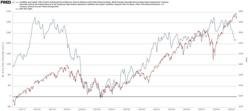 파란선 지급준비금이 초록선 TGA 잔고 증가와 함께 7월부터 지속적으로 감소했습니다. 빨간선 역레포 잔고는 완전히 소진되었구요. 역레포에 묶인 유동성이 바닥났으니, 재무부 단기국채 발행 급증으로 인한 TGA 증가로 지급준비금이 감소충격을 받는 것은 자연스럽죠.