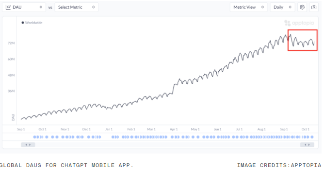 ChatGPT 앱의 일일 적극 활용 사용자 (DAU : Daily Active User) 수는 9월 이후 정체되었습니다.