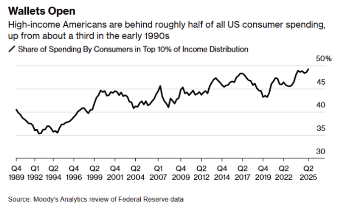 하지만, 이 모든 시그널을 무시하는 시장. AI에 대한 시장의 기대감은 식을 줄 모르고 증시를 끝없이 밀어 올립니다. 이제 증시는 그냥 하나의 자산군 이상의 의미를 가지게 되었어요. 증시 급등에 의한 부의 효과가 고소득 / 고자산층의 강력한 민간소비를 지탱하는 가장 강력한 버팀목이 되었습니다.