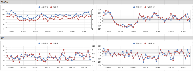 주요 권역 별로 보면... 빨간선 일평균 수출액이 가장 크게 늘어난 권역은 중국입니다. 압도적이죠. 미국, EU 아세안은 보합 내지는...