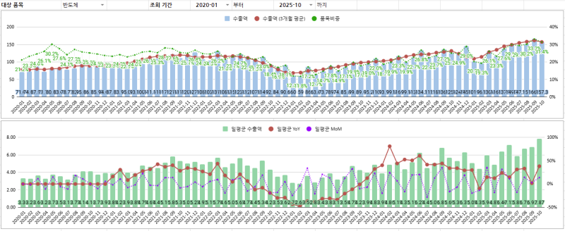 먼저 반도체. 상단의 전체 수출액은 9월에 비해서는 소폭 줄었죠. 조업일이 적었으니 당연합니다. 하지만, 하단의 일평균 수출액은 역대 최고치를 찍었습니다.