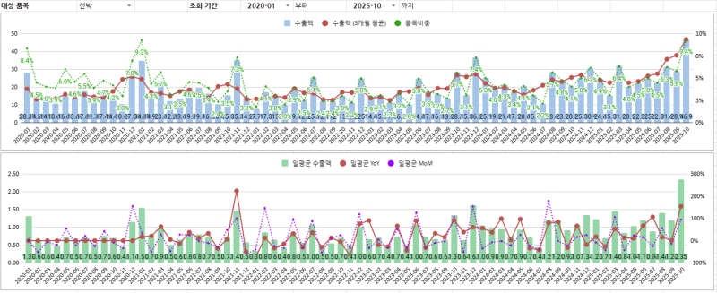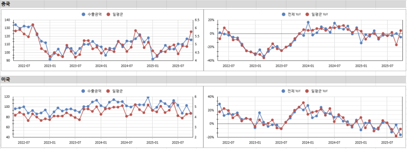 다음은 선박. 선박은 사실 한 번에 움직이는 금액이 커서 들쑥날쑥합니다. 이를 감안하더라도 2024년 하반기부터 전체 수출액의 규모가 한 단계 레벨업 된 것을 알 수 있고, 10월의 수출액은 유달리 크게 증가했습니다. 전체로 봐도, 일평균으로 봐도 마찬가지죠.