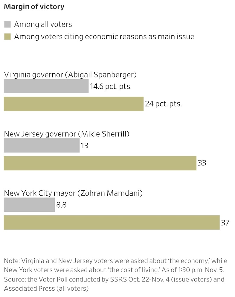 뉴욕시장, 버니지아 주지사, 뉴저지 주지사 선거에서 공화당이 전패했습니다. 그것도 굉장히 큰 마진으로 졌어요. 주된 패배요인? 2024년 대선과 직전 상하원 선거의 공화당 승리 요인과 동일합니다. 팍팍한 살림살이.