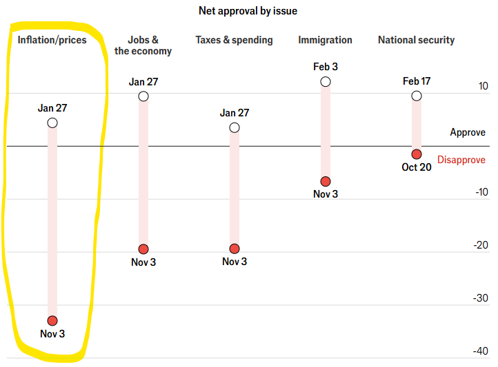 허나, 정작 트럼프가 집권한 이후에도 물가는 잡히지 않았고, 위 차트에서 보다시피 물가에 대한 유권자들의 트럼프 행정부에 대한 시각은 완전히 얼어붙었습니다. 이 상황이 결국 이번의 참패를 가져오게 된 거죠.