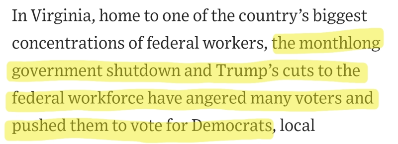 연방 정부 근로자의 비중이 가장 높은 버지니아 주에서는 정부 셧다운 장기화와 트럼프의 공공 인력 대규모 해고 조치가 민주당으로 표가 몰리게 만들었습니다.