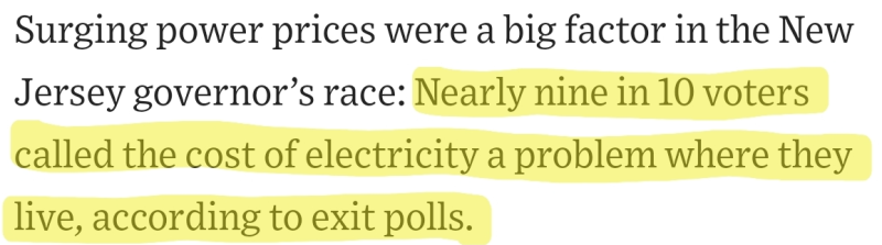 뉴저지 출구조사에서는 10명 중 9명의 유권자가 전기료의 급격한 인상을 문제로 지적했습니다. 이 부분은 AI 인프라와도 관련된 내용이니 별도의 포스트로 다루어 보도록 하고...