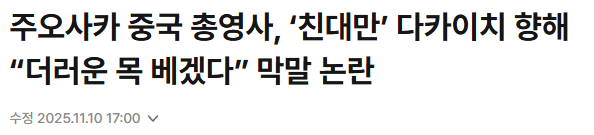 중국의 이런 반응은 당연하다면 당연함. 대만은 중국의 역린으로 미국조차 함부로 건드리지 않는데, 고작 갓 선출된 일본 총리가 이런 망발을 뱉어 감히?... 일본 야당 내에서도 각종 비난 선언이 쏟아지고 있다는데, 굳이 찾아보지는 않았음. 당연히 그렇겠지 뭐.