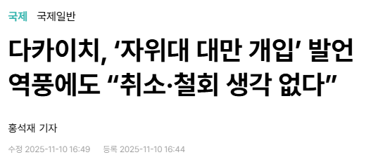 8일의 발언이 일파만파 파장을 불러왔지만, 다카이치는 오늘 다시 강조... 자위대 대만 개입 ...