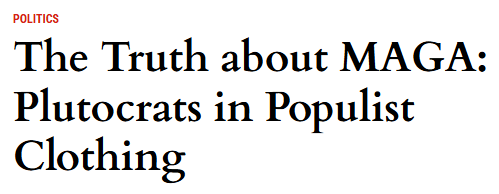 서민들은 수 세대에 걸치면서 지속적으로 경제적, 정치적 약탈을 당했고, 그 결과 극소수에게 모든 권력이 집중되어 있는 상태가 되었기에 (big tech, big pharma, big arms), 이를 되돌리고자 한다... 따라서, MAGA는 이러한 극소수에 의한 힘의 집중이라는 결과를 낳은 자본주의를 배척하며, 트럼프는 이러한 little guy들을 위한 싸움의 선봉장이라고 합니다.