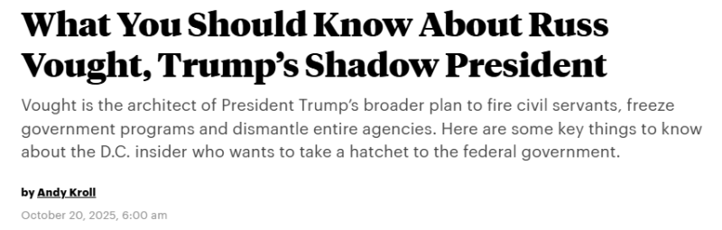 그리고 무엇보다... 이전 포스트에서 몇 번 언급했던 트럼프 행정부의 마스터 마인드이자 행정예산 집행을 총괄하는 관리예산실장을 맡고 있는... 실세 중의 실세인 Russell Vought는 Project 2025의 저자 중 한 명입니다. 상당히 많은 이들은 Russell을 그림자 대통령이라 평가하고 있죠.