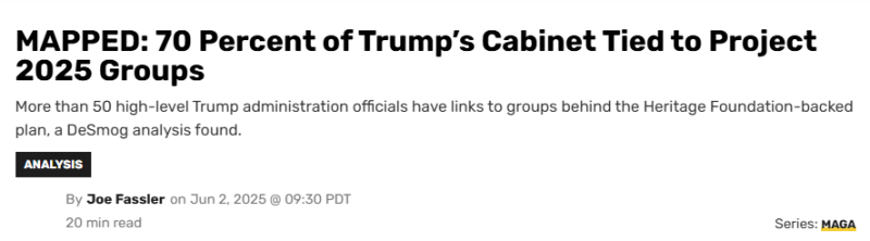 민주당 친화적이기는 하지만, 미국 언론에서는 트럼프 행정부 인사들 중에 Project 2025 관련 인사들이 다수 포함되어 있음을 반복적으로 지적해 왔습니다.