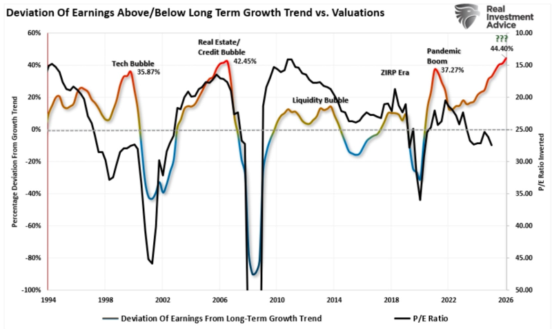 무지개 라인은 S&P500 상장기업들의 이익전망치가 장기 평균에서 얼마나 이격되었는가를 보여줍니다. 0을 중심으로 높아질수록 장기평균 대비 이익전망치가 많이 높다... 는 거죠. 현재 수준을 보면 25년말 기준 이격도가 44.4%를 기록했습니다. 1994년 이래 가장 높죠.