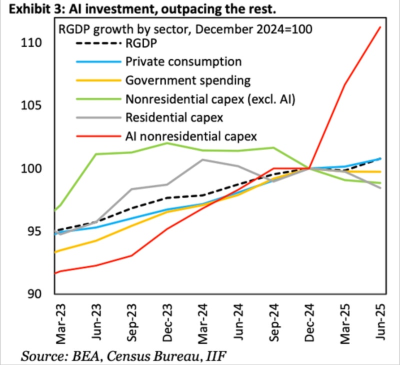 미국의 GDP 성장률이 4%를 넘긴다 어쩐다 하지만, AI 자본투자의 급상승에 대한 의존도가 너무 높습니다. 민간소비 (파란선) 도 성장 중이지만, 그 내부에는 심각한 빈부격차가 숨어있죠.