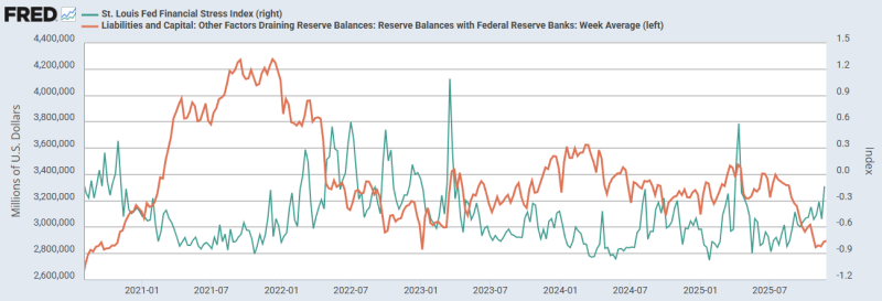 주황선 지급준비금과 초록선 세인트루이스 FSI도 반대 추세로 움직입니다. 지준금이 늘어나면 머니마켓 스트레스 감소, 지준금이 지금처럼 급감하면 머니마켓 스트레스 증가... 현재 지준금 레벨로는 단기자금 시장 스트레스가 쉽게 잡히지 않을 공산이 큽니다. 그리고, QT를 종료한다 해도 지준금의 극적인 증가도 의심스러워요.