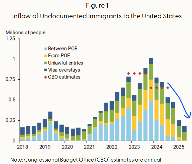 여러가지 원인이 있겠지만... 가장 큰 변화는 이민의 급격한 감소라고 생각됩니다. CBO의 추정에 따르면 불법 이민자의 유입이 대략 24년 하반기부터 급격히 감소했음을 알 수 있습니다. 모든 이민자들은 높은 경제활동 의지를 가집니다. 놀려고 이민 온 사람은 없으니까.
