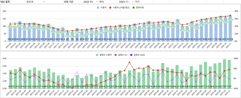 이렇다 보니 상단 차트의 초록선을 보면, 반도체가 전체 수출에서 차지하는 비중이 34.5%까지 늘어나 1/3 이상이 단일 품목에 의존하는 모양새가 되었죠. 불과 1년 사이에 반도체 비중이 10%나 ...