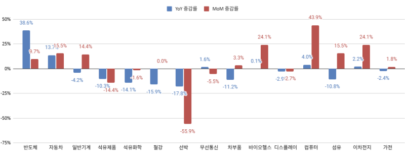 품목 전체 수출규모... 전체 규모로 보면 반도체가 여전히 증가세가 가장 강하고, 바이오, 컴퓨터, 섬유, 2차전지 품목이 전월 대비로 증가했습니다.